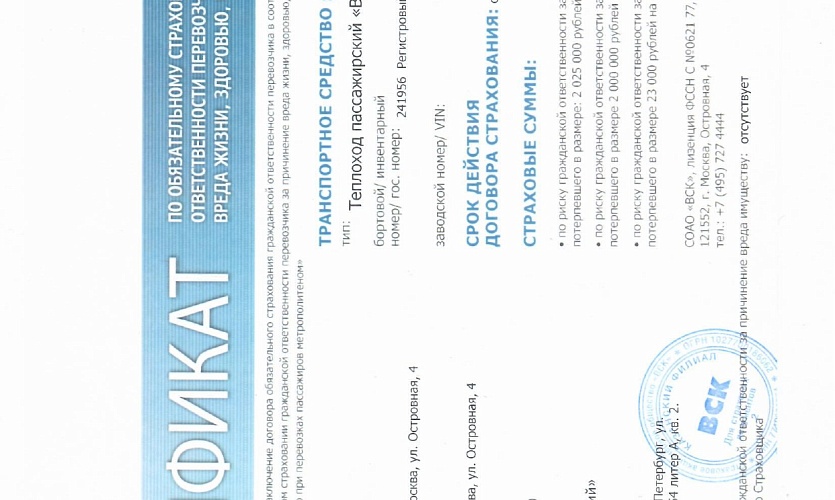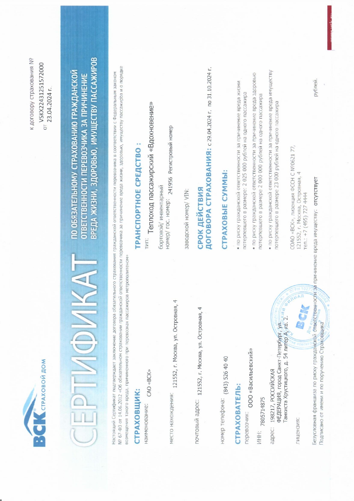 Сертификат к договору страхования №VSKX22517887236000 от 23.04.2025 по обязательному страхованию гражданской ответственности перевозчика за причинение вреда жизни, здоровью, имуществу пассажиров выдан САО «ВСК» перевозчику ООО «Васильевский». ИНН 7805714875 Срок действия договора страхования: с 25.04.2025 по 31.10.2025 г.