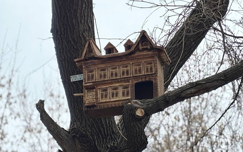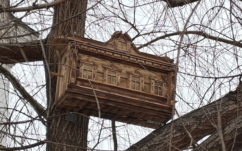 Сад Дома-музея В.И. Ленина https://kazan.travel/projects/dostoprimechatelnosti/dom-muzey-v-i-lenina/ украсил скворечник в виде фасада дома, ранее стоявшего на ул. Достоевского, 61. Двухэтажное деревянное здание построено в 1911 году в стиле европейского модерна. Дом утрачен на рубеже XX–XXI веков.
