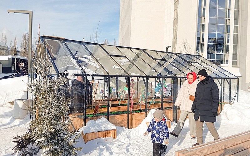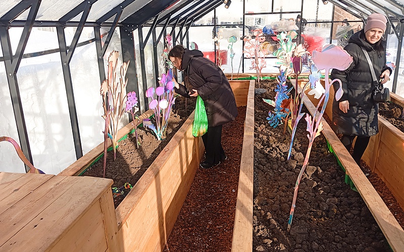 Но и зимой теплица не пустует. Здесь располагается инсталляция художницы Зульфии Илькаевой «Этот цветок тебе», которая пользуется вниманием женщин. Фото: Дмитрий Сивков
