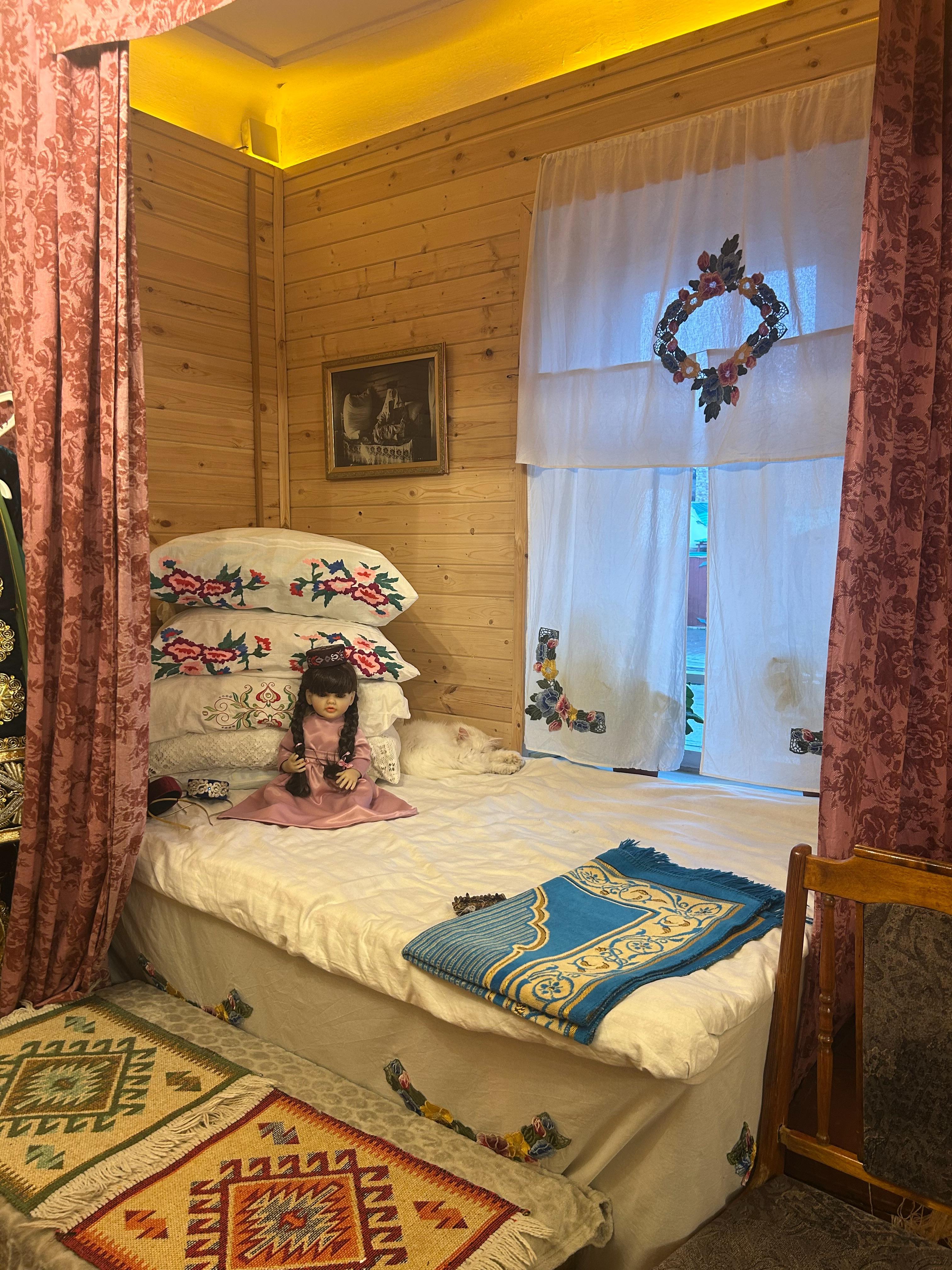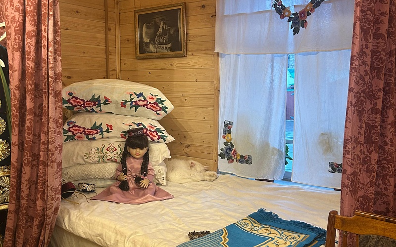 Интерьер дома воссоздан с большой точностью: здесь можно увидеть традиционную посуду, мебель, утварь, элементы женского рукоделия и, конечно, приданое невесты — важнейшую часть свадебной культуры.