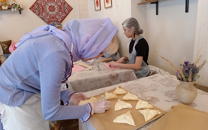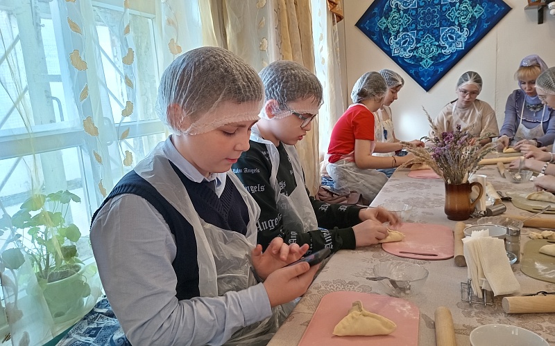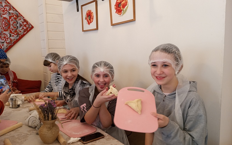 Сначала на мастер-классе ребята под руководством сотрудников музея с увлечением готовили традиционное блюдо татарской кухни — эчпочмаки (треугольники). Готовили как настоящие повара — в фартуках, шапочках.