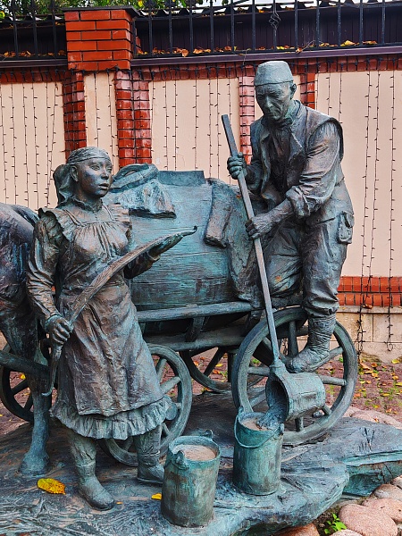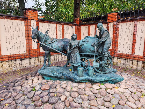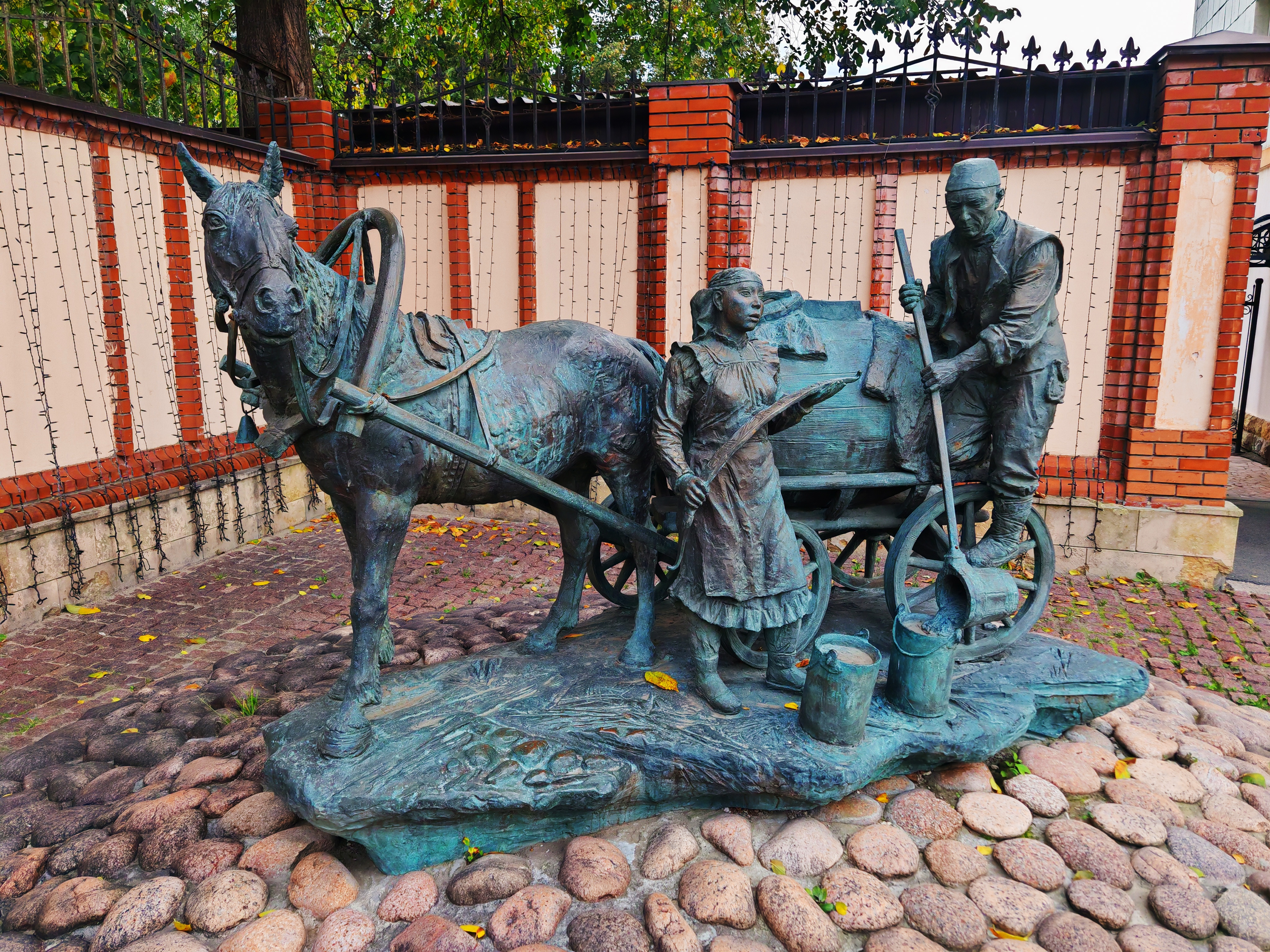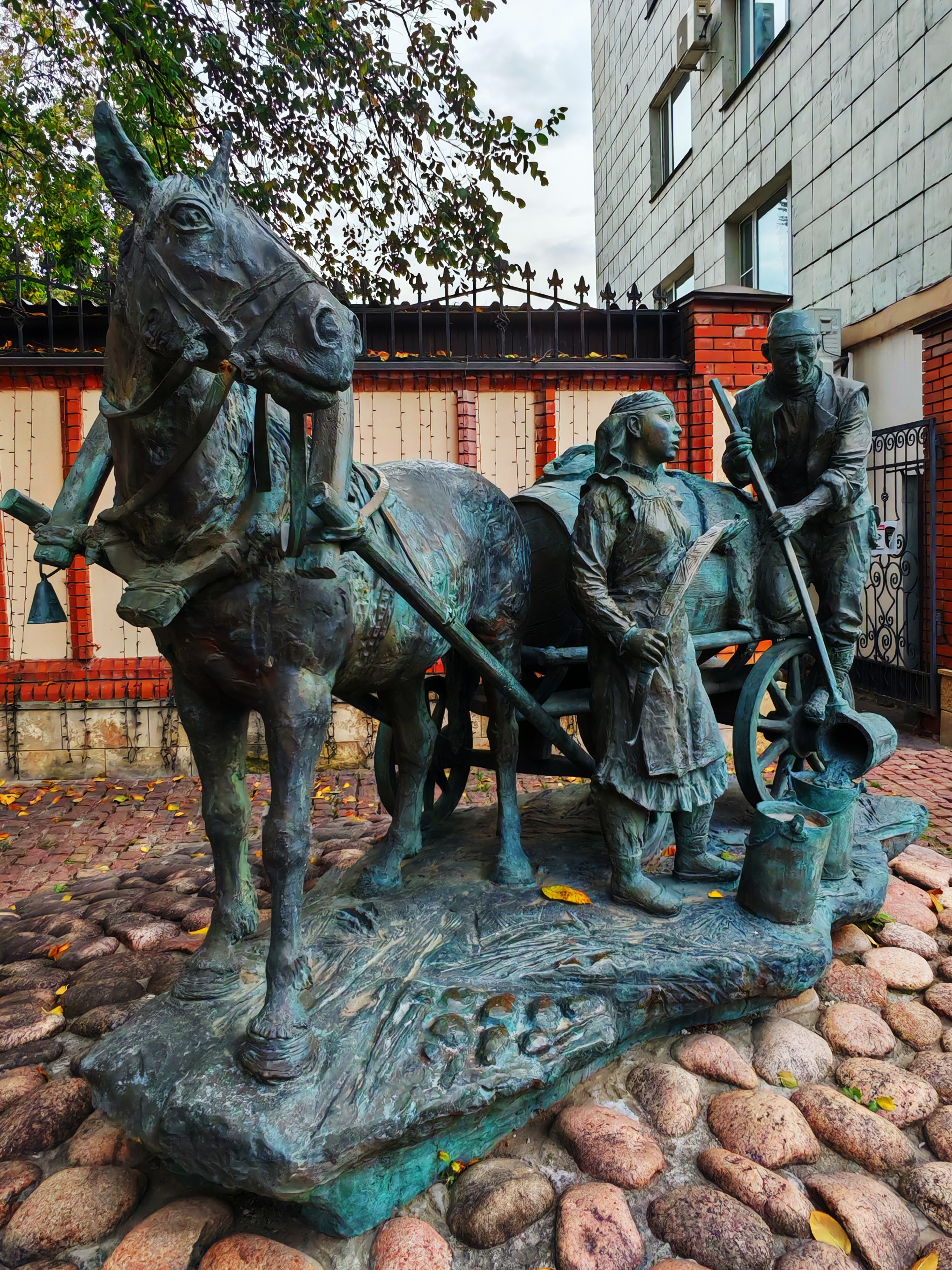 Первоначальная задумка — скульптура должна была быть выполнена в виде питьевого фонтана, вершину которого украшает миниатюрная композиция в виде водовоза, наполняющего вёдра юной горожанки водой из бочек с помощью специального черпака. Позже было решено убрать фонтан, а фигуры персонажей увеличить почти в натуральную величину.