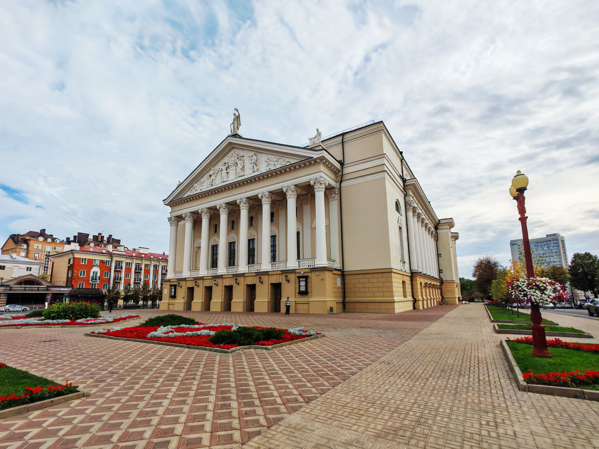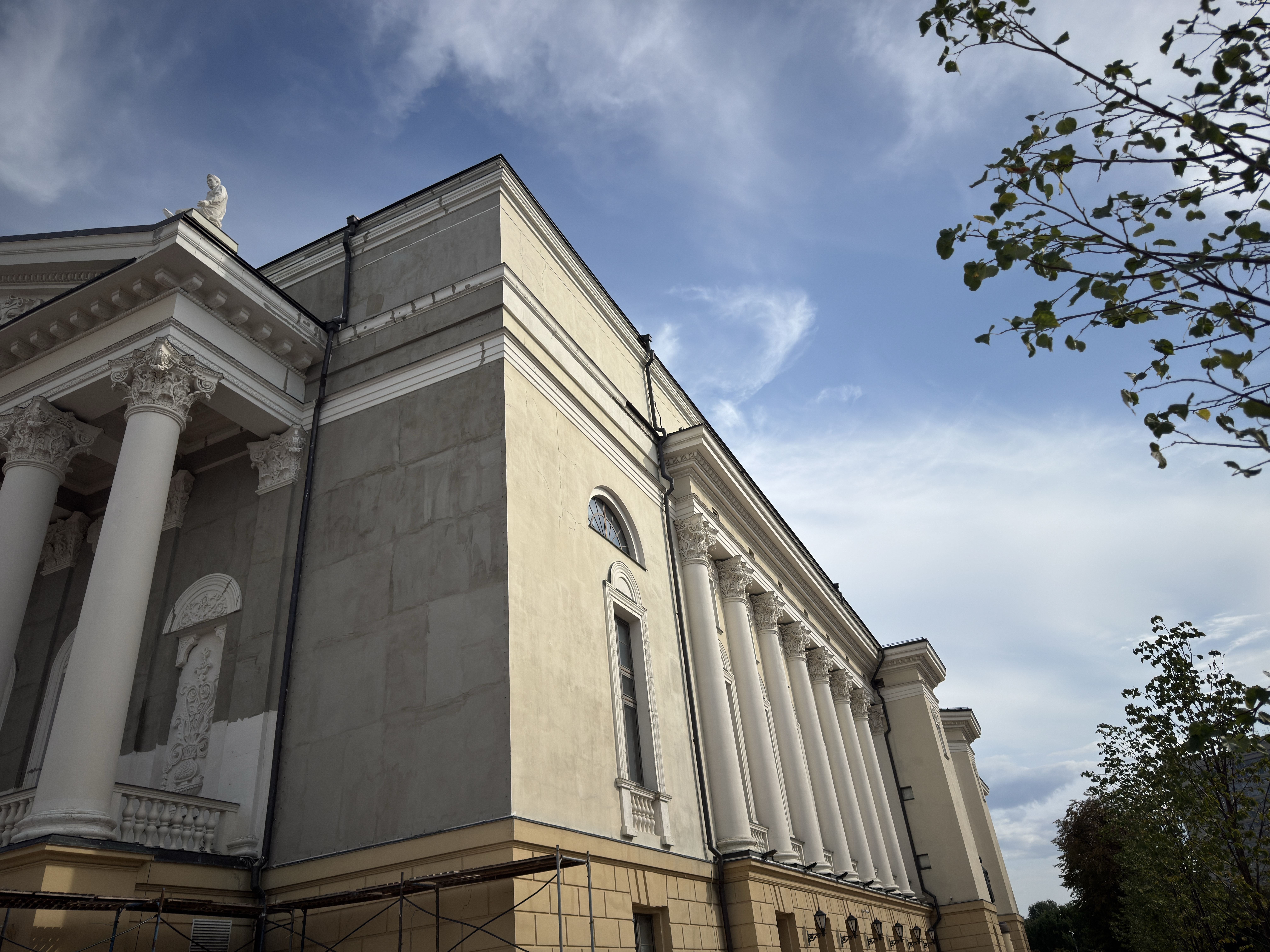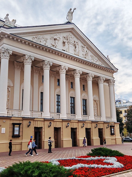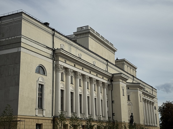 Здание театра, созданное в стиле советского неоклассицизма, впечатляет монументальностью: