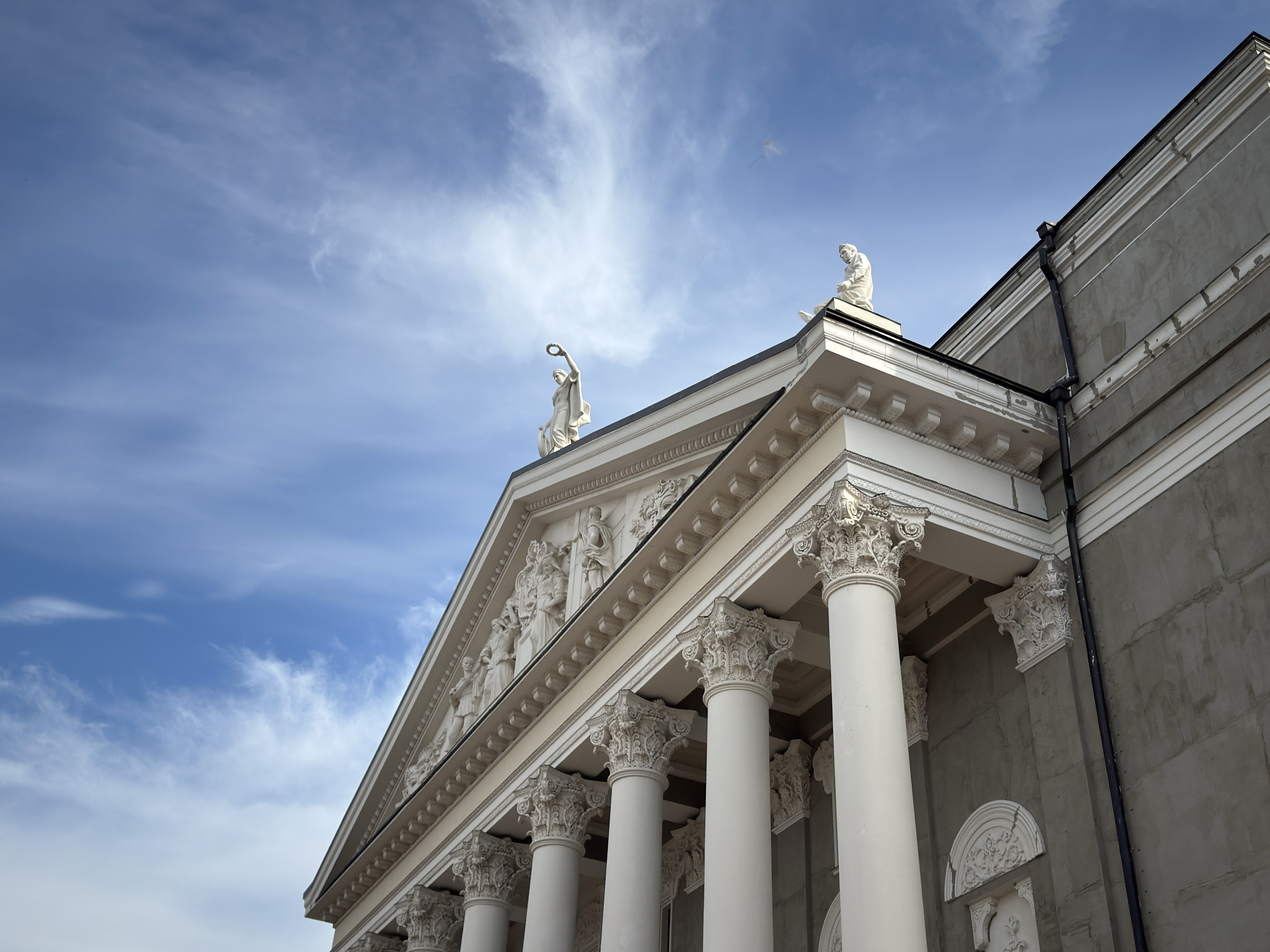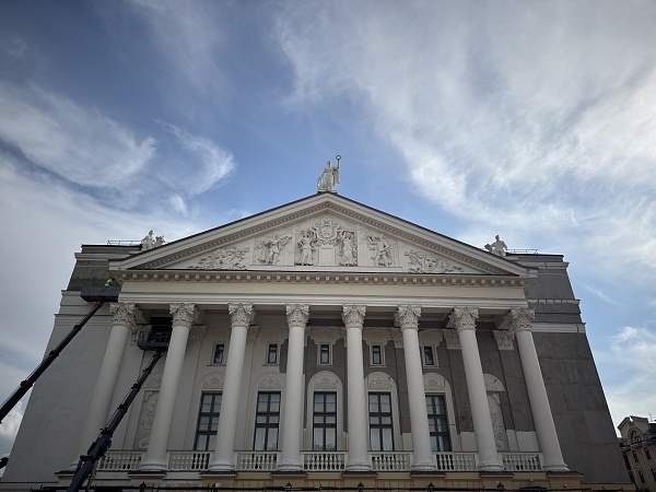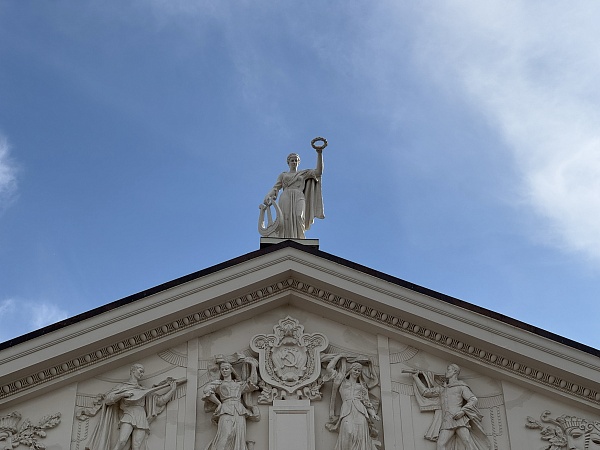– Фасад: портик с колоннами и скульптурами, символизирующими оперу и балет.