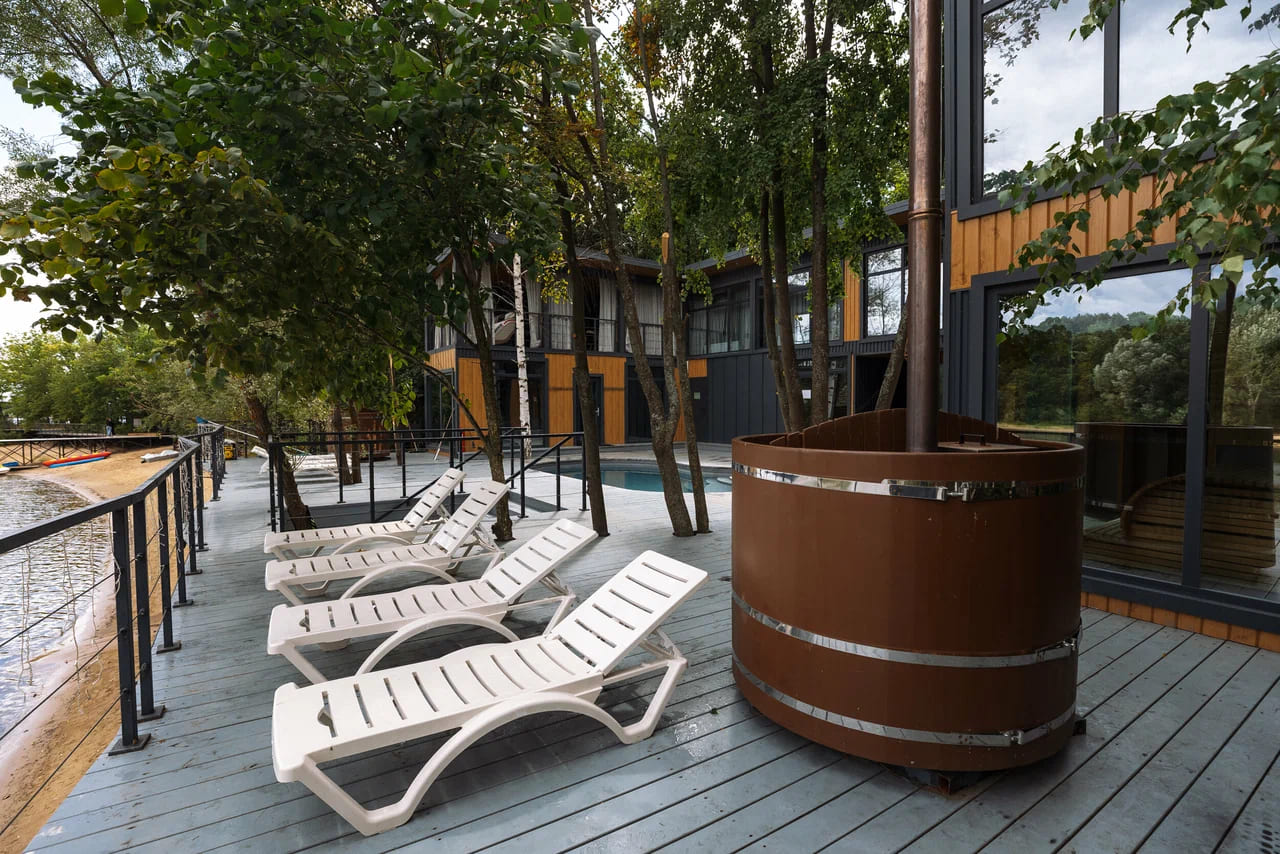 Незабываемые эмоции подарит роскошный центр с банным комплексом и теплым бассейном. Для утренних занятий йогой или неспешных вечерних променадов мы построили набережную с оборудованными спусками к воде, гамаками, общей костровой зоной. Прогуляться можно и по подвесной аллее, расположенной под верхушками деревьев, никакой специальной подготовки для этого не требуется.