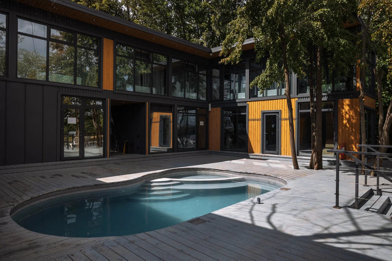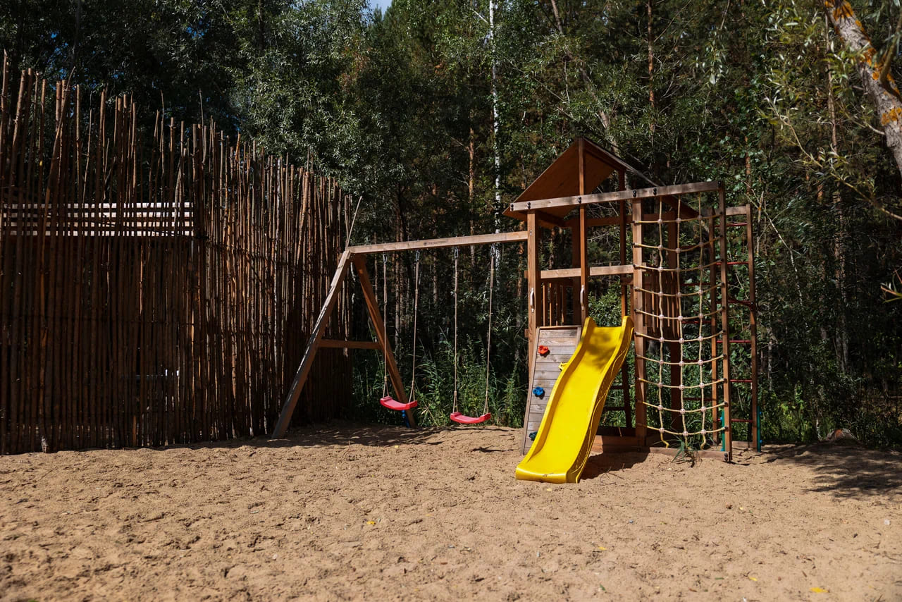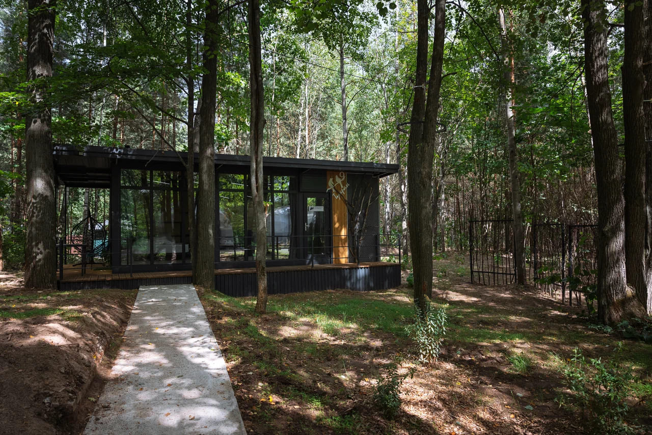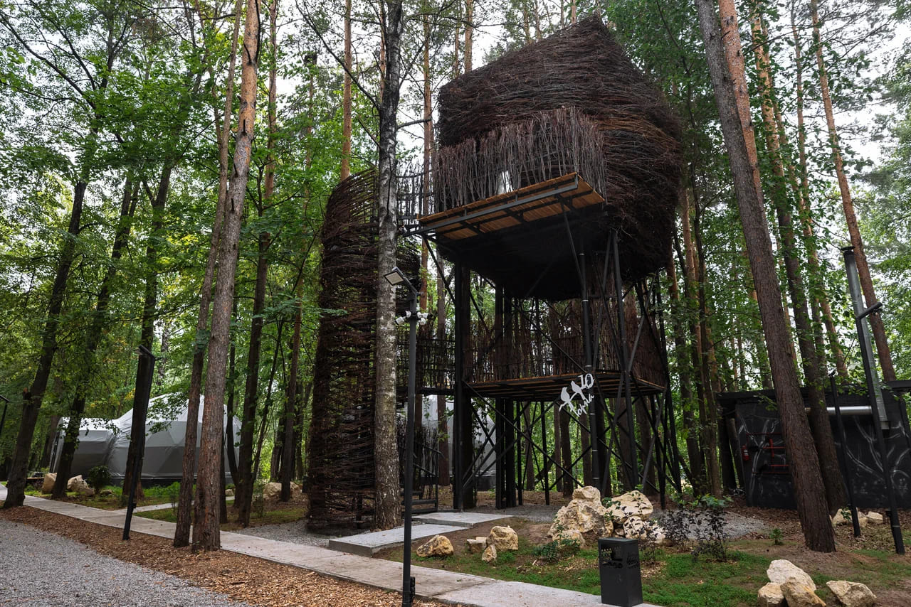 На берегу Волги в окружении соснового леса уединенно друг от друга располагаются 52 бунгало и коттеджей с индивидуальными террасами и зонами патио. Особый восторг у гостей вызывает зеркальный дом на дереве с собственным подвесным мостом, являющимся самым высоким домом на дереве в Европе, а так же уникальный арт объект подобного формата з дом в виде гнезда на дереве.