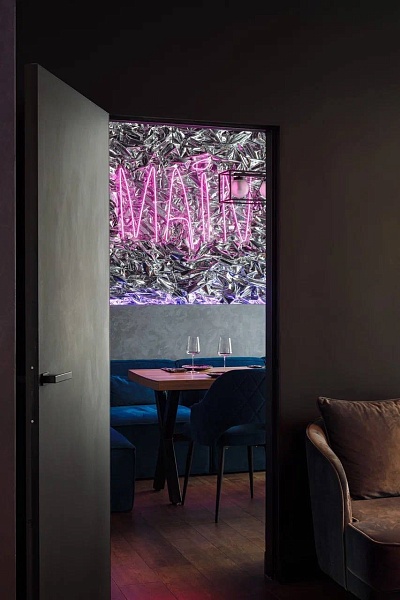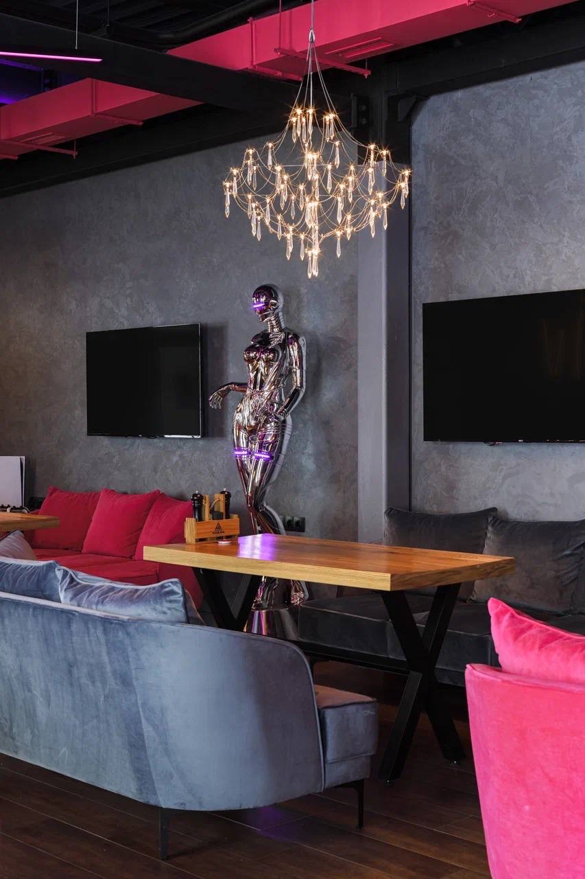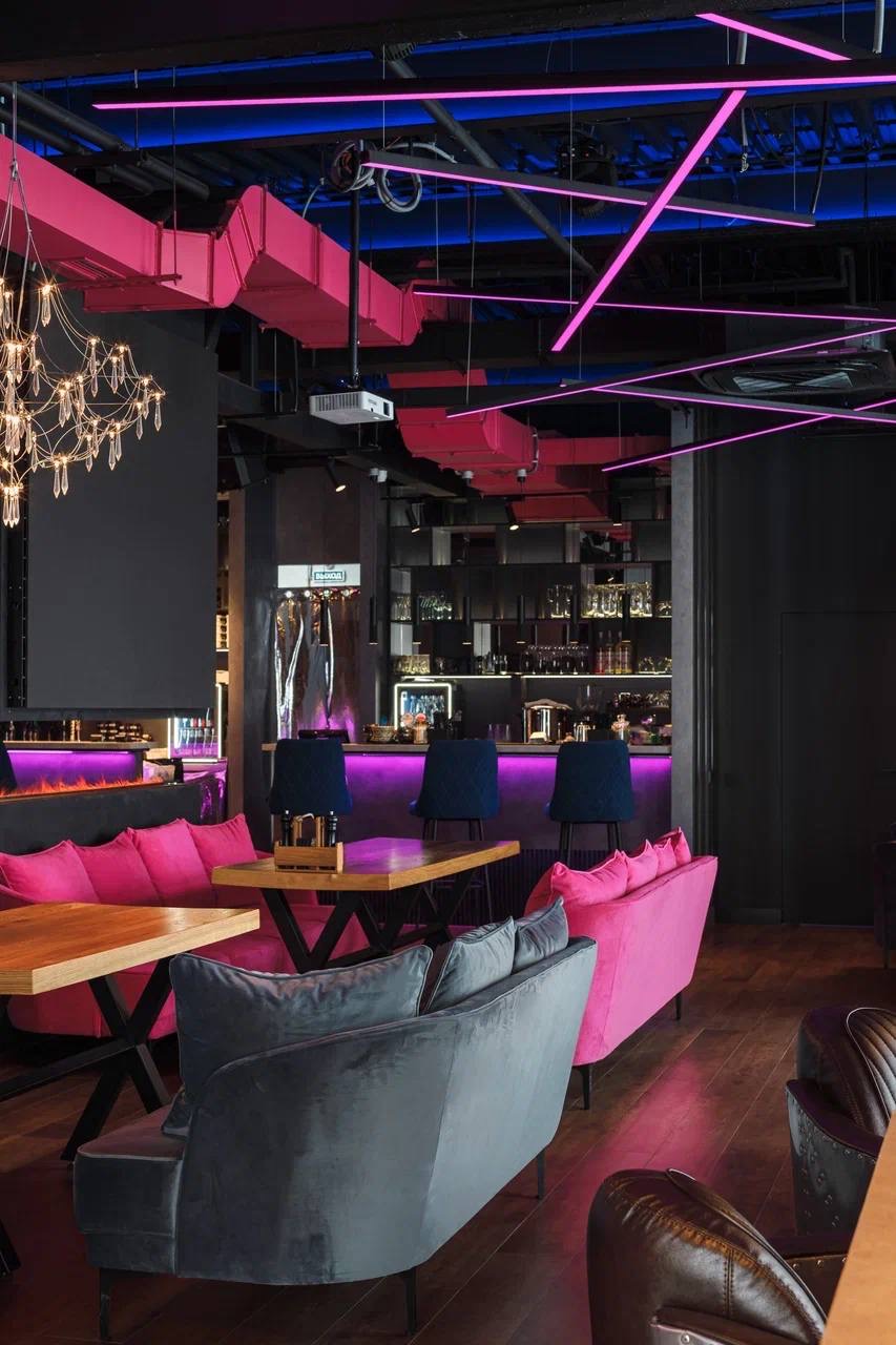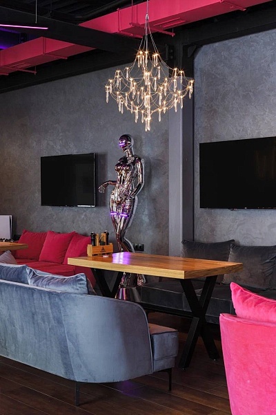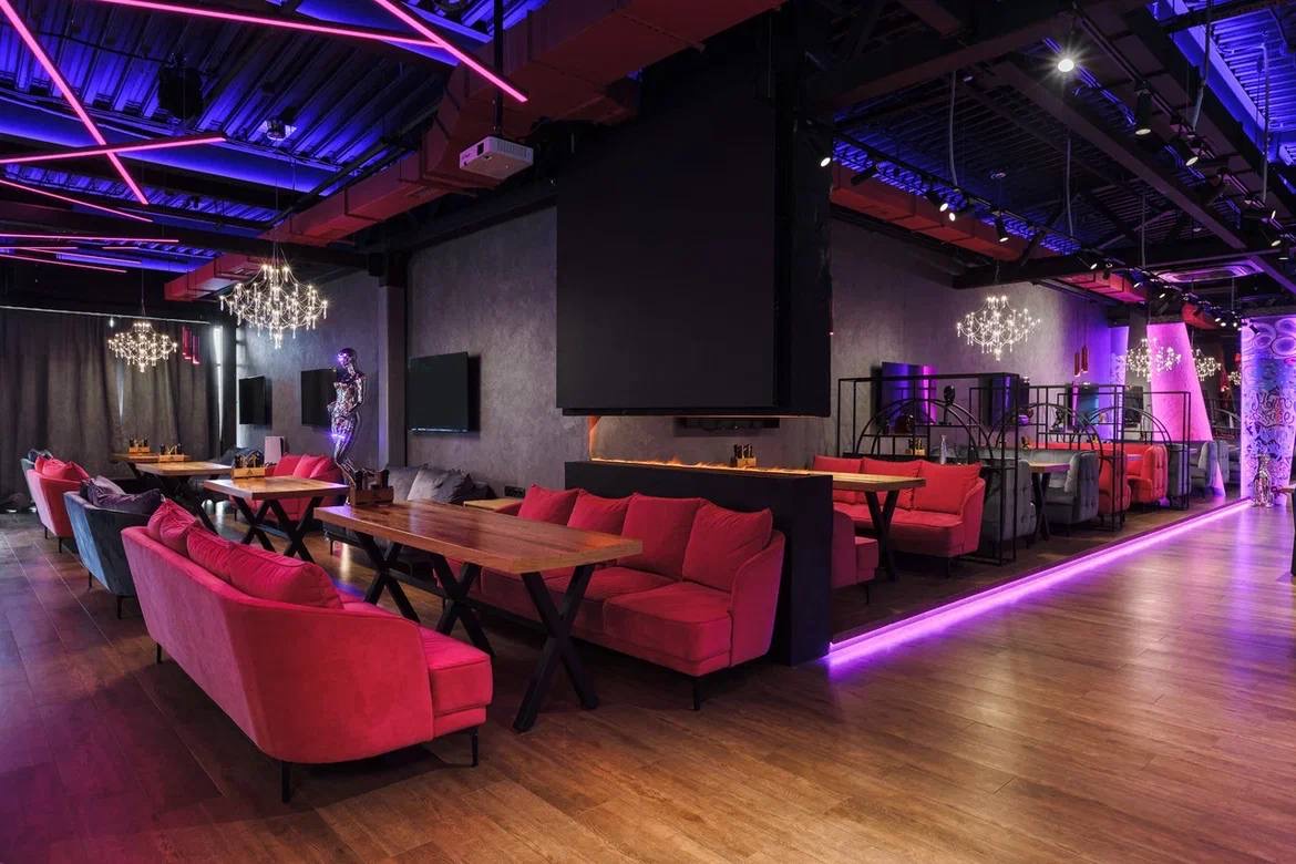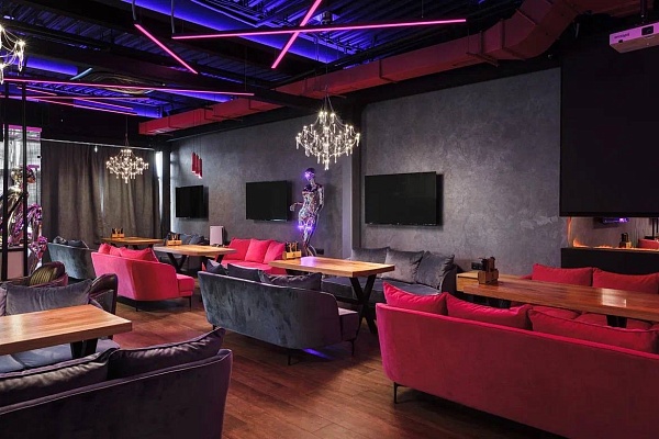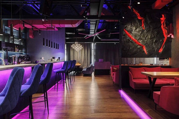 - Основной зал на 72 посадочных мест с контактным баром, кальянной зоной и караоке